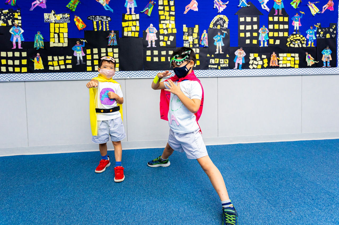 In a tropical land far, far away there was a school. It was a beautiful and magical place, filled with fun and laughter. In this school, there were 44 children who all wanted to become Superheroes. So they listened to their teachers, cooperated with their friends and set to work. They created capes, terrific t-shirts, marvellous masks, brilliant belts and shiny shields. They trained and trained. They were kind and helpful, appreciated others and they never, ever gave up. They tried and tried with all their might and…WHOOSH, BANG, POW, KABOOM! You did it K2! Superheroes to the Rescue!